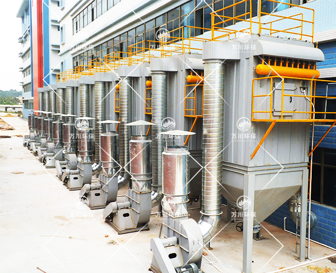 因生產打磨工藝品時會產生大量的粉塵氣體,秉承對員工生產環境負責的態度,美景實業在對比多家廢氣處理廠家后,最終決定采用萬川環保廢氣處理設備--脈沖布袋除塵器。